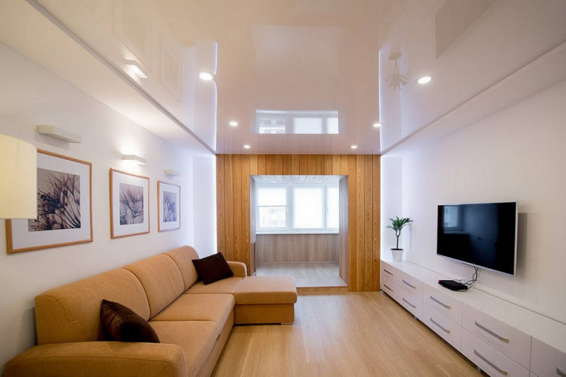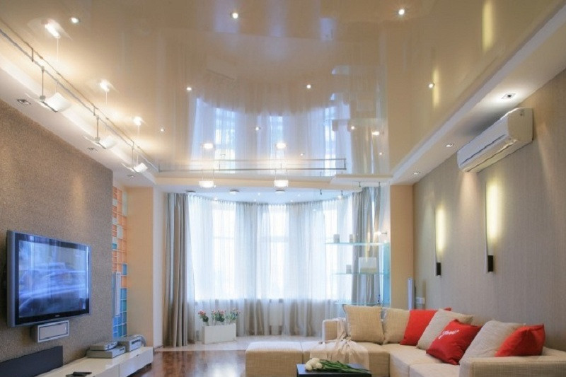 Такой потолок обладает всеми свойствами натяжного покрытия. Если он изготовлен из пленки ПВХ, об отделке и мебели вы можете не волноваться.