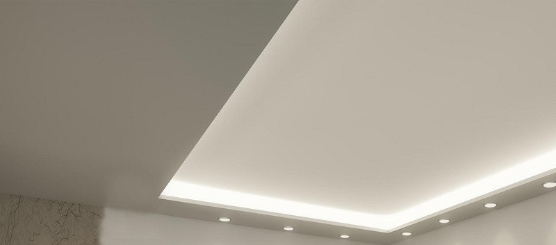 Важно соблюдать правило удаленности ламп от поверхности потолка, так как они будут ее нагревать. Особенно это критично для ПВХ. Для декорирования двухуровневых потолков используют только светодиодные ленты.