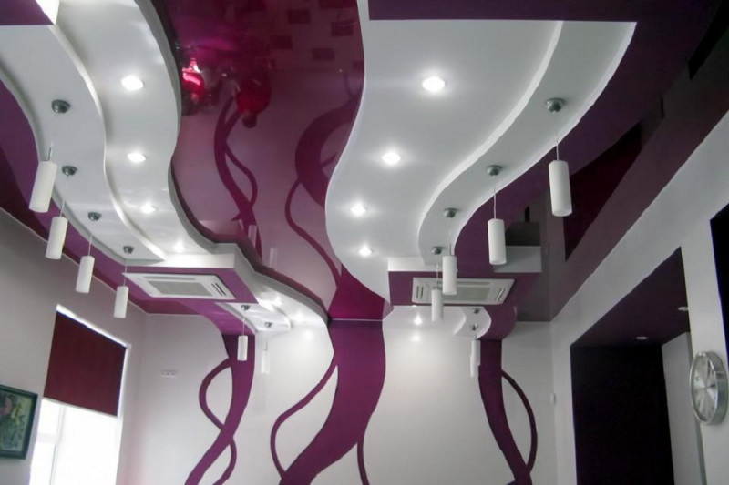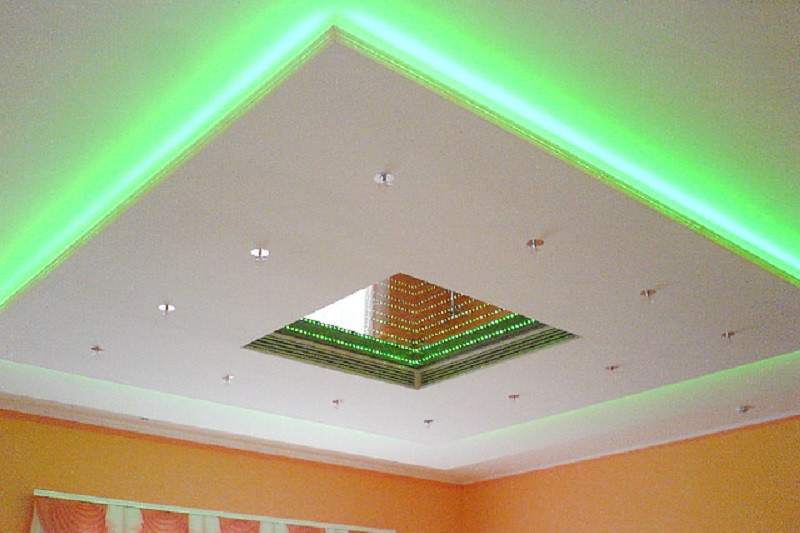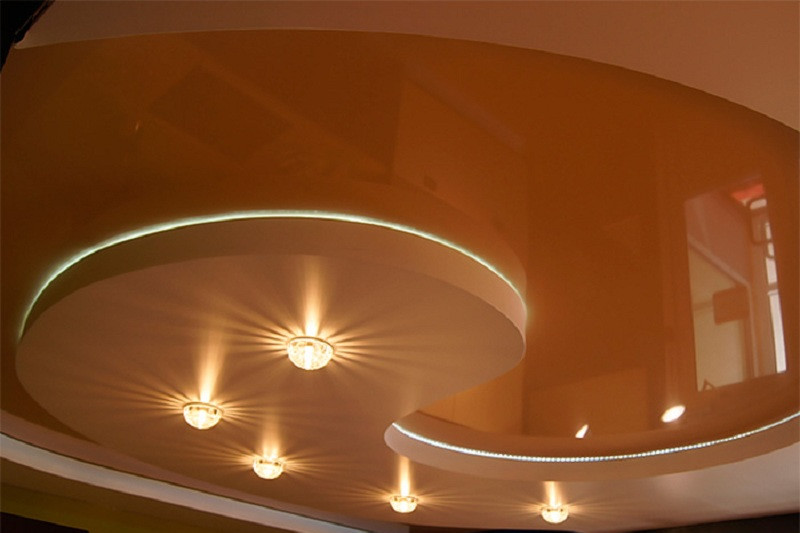 Благодаря нескольким ярусам такая конструкция позволяет создавать сложные системы освещения. Встраивать подсветку не только по периметру комнаты, но зонировать помещение.