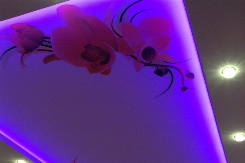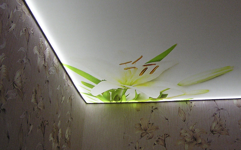 Особенно эффектно смотрится натяжной потолок с фотопечатью и подсветкой.