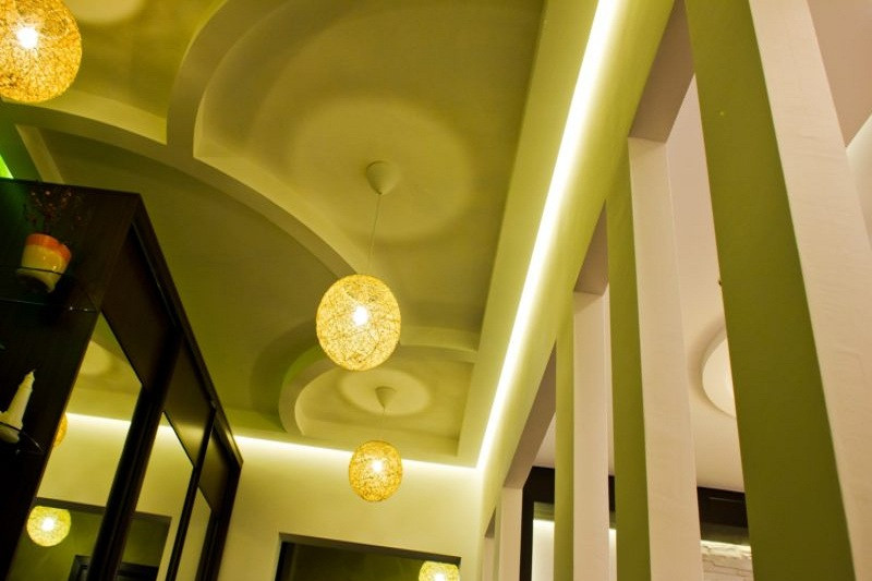 Такой потолок обладает всеми свойствами натяжного покрытия. Если он изготовлен из пленки ПВХ, об отделке и мебели вы можете не волноваться.