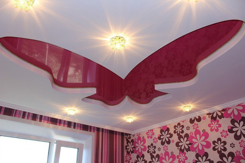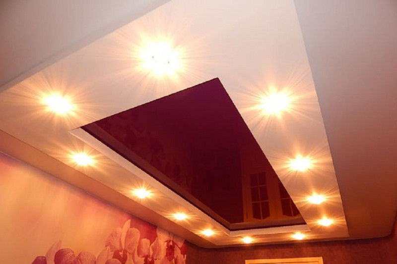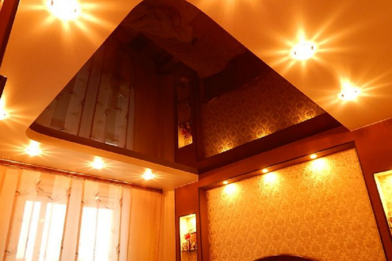 Есть много вариантов для конструкций, выгодно подчеркивающих достоинства комнаты: с подсветкой и без, с блеском и матовые, в один уровень и несколько.