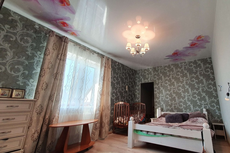 • Матовые полотна обеспечат больший уют и камерность, а глянец, особенно в темных тонах будет отражать не хуже зеркальной поверхности.