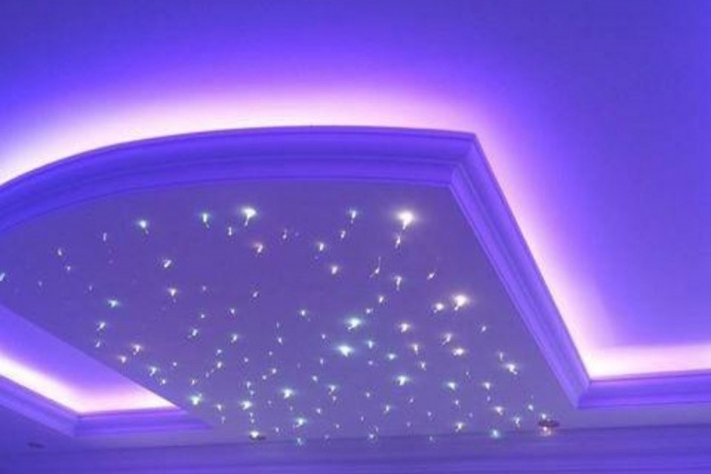 Все зависит от сложности предстоящих работ. Конструкция в один уровень с уже имеющейся проводкой потребует полтора-два часа. «Звездное небо» с оптоволоконными нитями или многоярусный потолок – до одного рабочего дня.