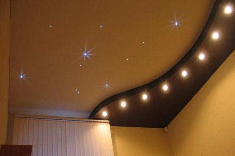 Основное правило – не перегревать натяжной потолок. По этой причине все нагревающиеся элементы ставятся с тем расчетом, чтобы до поверхности жар не доставал. Оптимальными являются светодиоды.