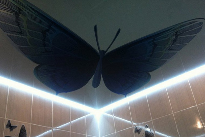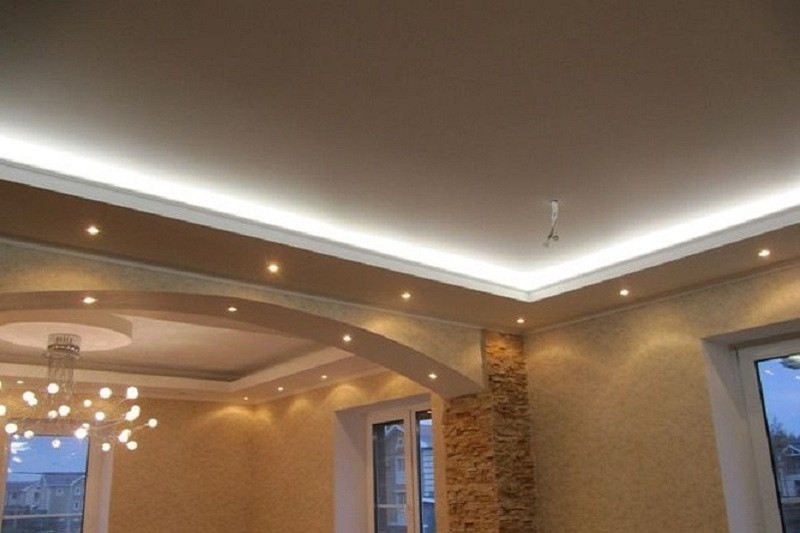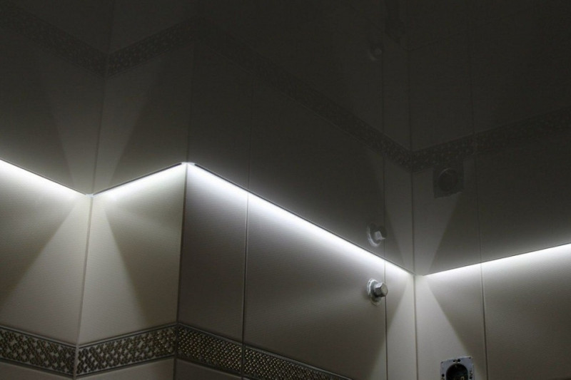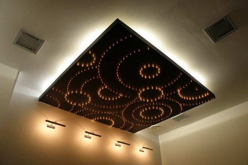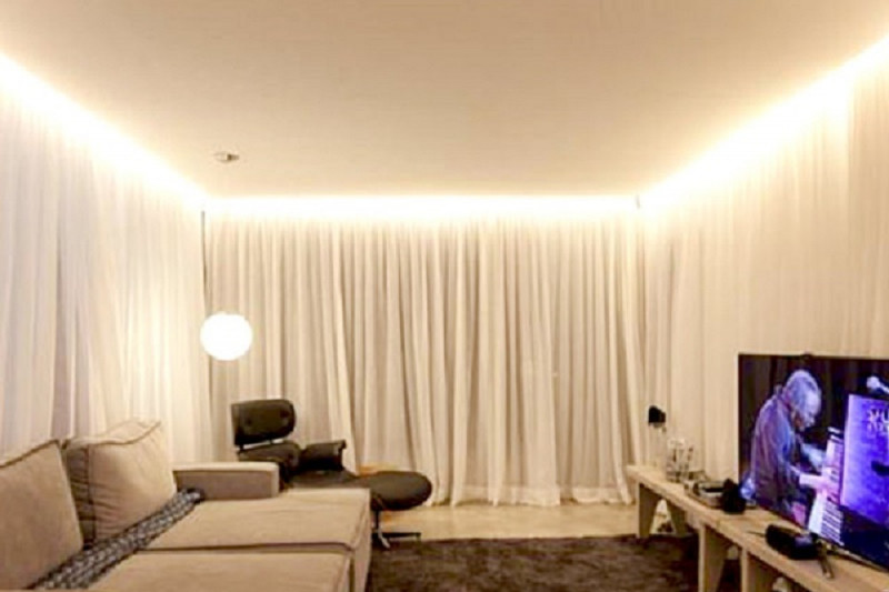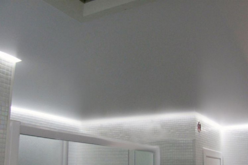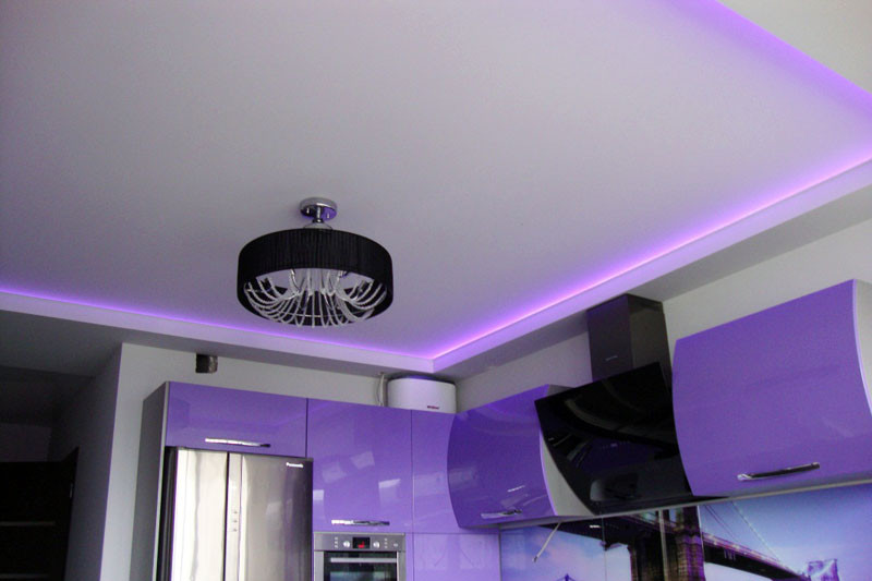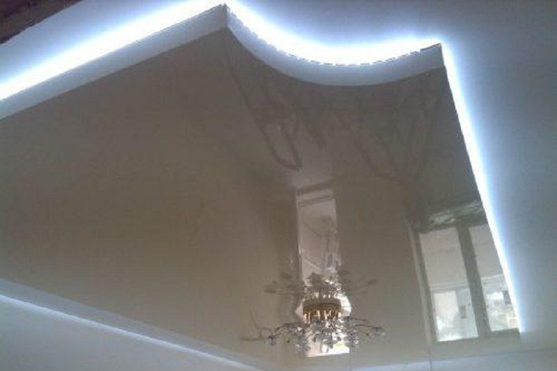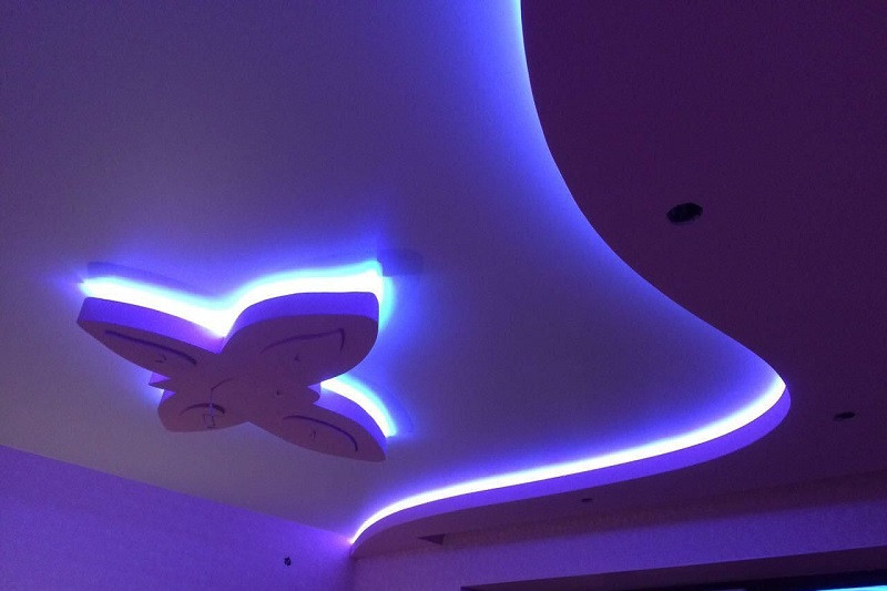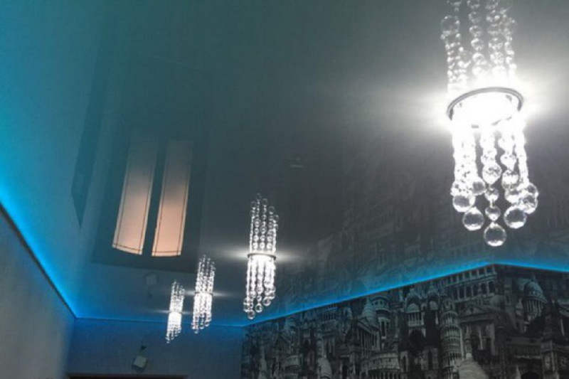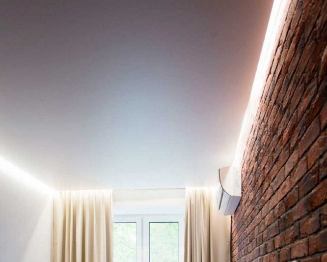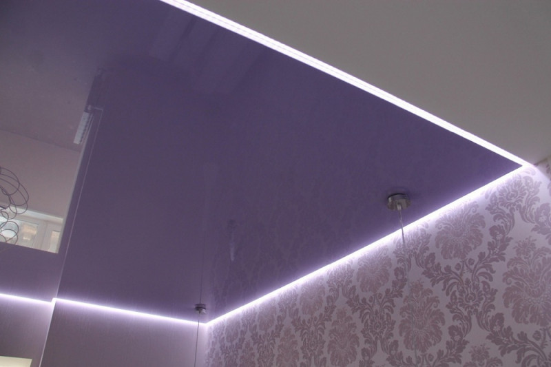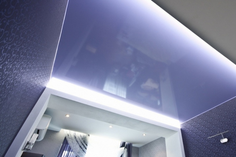 Такой вид потолочного покрытия изготавливается из пленки ПВХ или ткани. По периметру всего помещения или вдоль одной стены монтируется специальный профиль, в который мастер закладывает светодиодную ленту. Ее не видно ни с одной точки в комнате при выключенном свете, но стоит его зажечь, как на стене и вдоль потолка проступает световая полоса. Это смотрится очень красиво.
